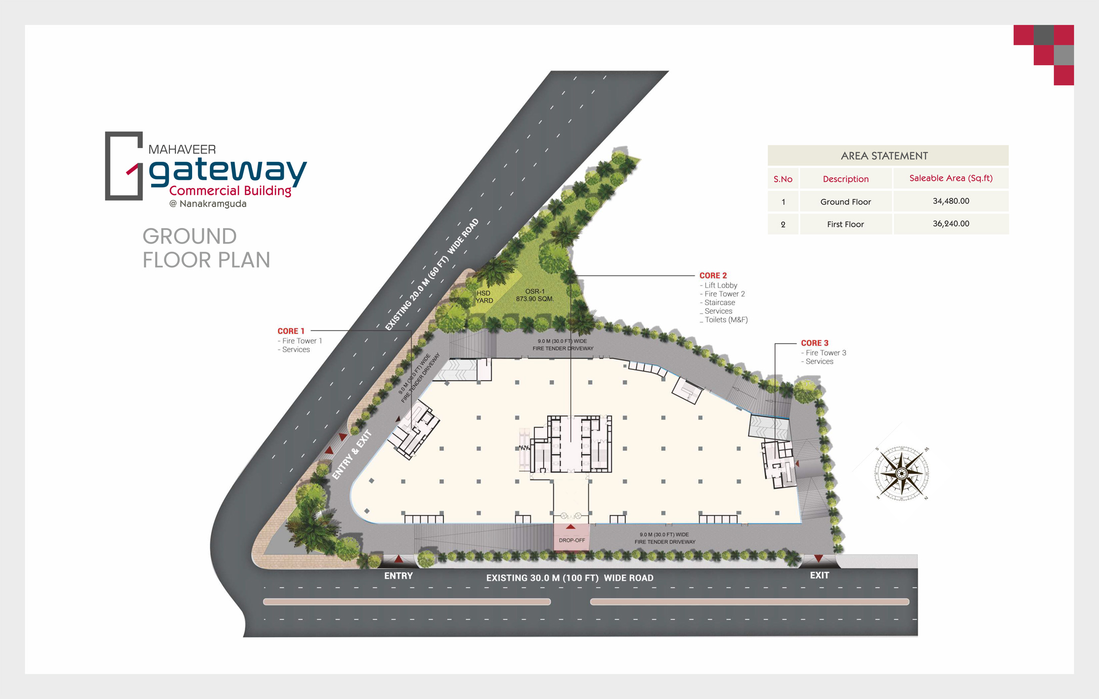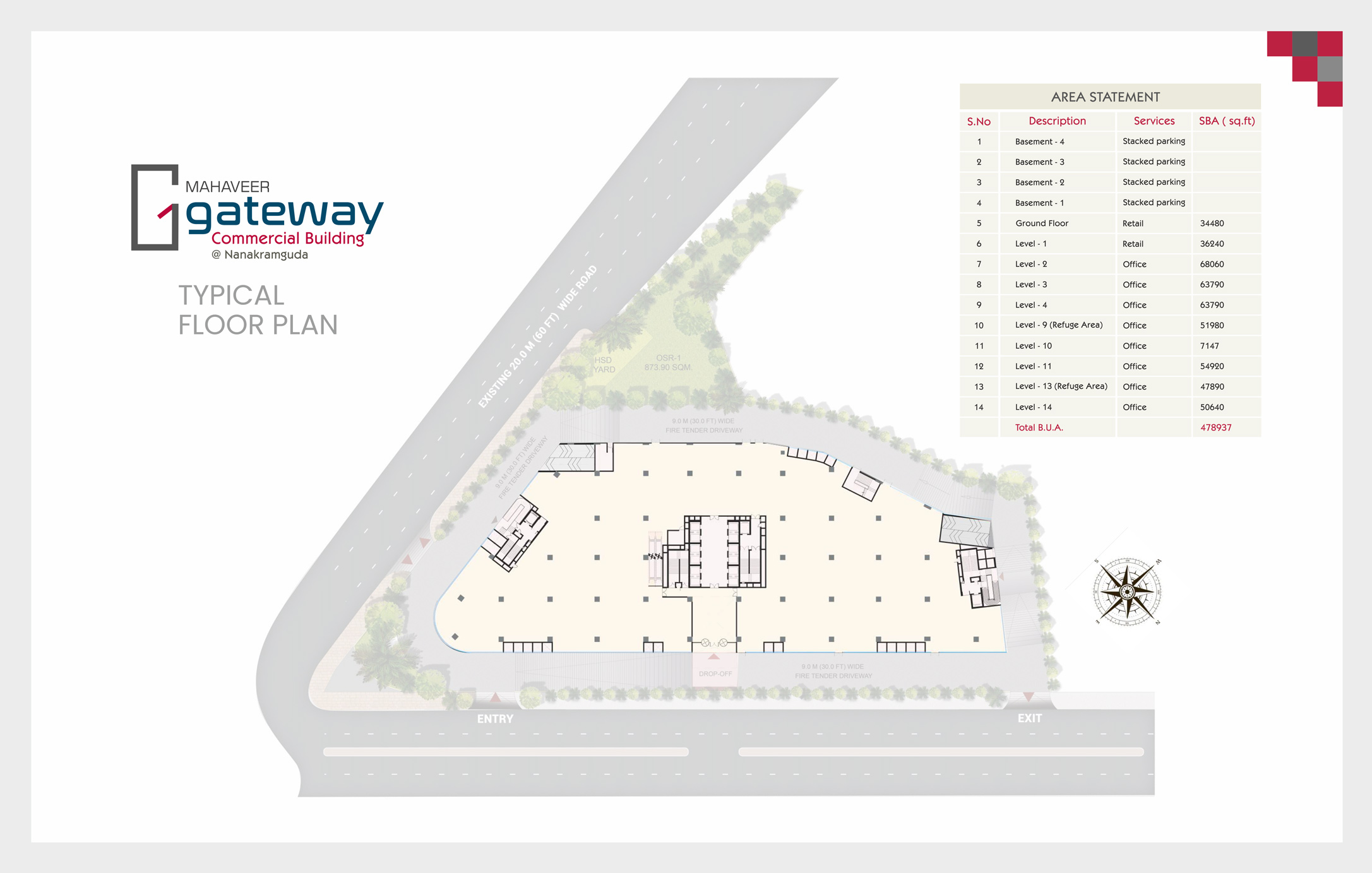 Mahavir Gateway has 4 basement (all basement stack parking) with a parking ratio of 1:1000 Mahaveer Gateway located in the Nanakramguda, Near Gachibowli, the premium superior grand office & retail spaces is very close to the Wipro and Infosys and the Financial District. The property is designed to serve your business needs well with all modern amenities backed by 24x7 security service. Excellent connectivity by public transport & with restaurants and hotels closer by, the area has a warm sense of community.